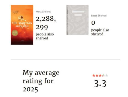 These are my most/least shelved. The books that I read in 2025 that were MOST read by other users, and the books that where the least read by other users. The most is a very popular book that I finally got around to reading last year, The Martian by Andy Weir. Very good book. I’ve read all of Weir’s books now. For the least shelved, you can’t see the title, but it’s Weird War Tales #103. I guess no one read that. I was actually reading through the first 20 or so appearances of the Creature Commandos, and that was one of them.