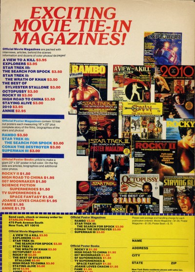 Here’s an ad from Fangoria 40 (1984).  Lots of good ones here.  Superman III.  Star Trek II and III!  Rocky II and III!  Sometimes these ads would also feature older magazines so clearing houses can clear out their stock to get new magazines.  Annie!  Not sure I’ve ever seen that one.  Conan the Barbarian.  The Best of Stallone mag shows up in TONS of ads I’ve seen.  I guess they never could sell it so it just kept showing up on all these ads.