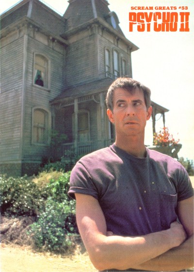 This week’s Scream Greats entry is a good one of Anthony Perkins on the set of Psycho II.  It comes from Fangoria #78 (1988).  If you haven’t seen it, Psycho II is a pretty good followup to the first Psycho.  Not to be confused with Robert Bloch’s Psycho sequel novel, also confusingly called Psycho II.  Bloch’s Psycho II is a pretty great little thriller tale on its own that is surprisingly meta for having been written in 1982.  I’d recommend it.  But the movie Psycho II is a more traditional sequel and is also a pretty good movie sequel considering it’s the followup to one of the greatest thrillers of all time.