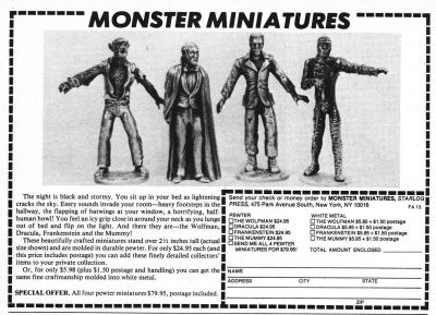 Vintage Monster-y ad goodness coming your way! This ad is from 1981, and it’s for mail away Monster Miniatures!  All four of these pewter figures sold as a group for $79.95.  Postage included!  You could also get them in a white metal for about $7 each.