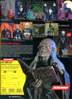 More monster-y goodness!  Here are two ads for Screamin’ Vinyl Model Kits!  The one on the left is from 1989.  It has four options; Jason, Freddy, Elvira, or the generic Werewolf.  Each model kid is about $60.  Honestly, they look pretty nice.  On the right is another Screamin’ models ad, this time from 1996.  They’ve greatly expanded their offerings with new product, but for some reason, Jason is missing.  You can’t even order him below.  However, amongst the new faces you see they added Leatherface, Ash, Lon Chaney from London After Midnight, Pinhead and the Cenobites, and one fantastic looking Crypt Keeper.  Different models have different prices, but this seems like a really nice model set.