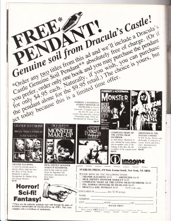 From 1987, check out this ad for buy 2 books and get a FREE Dracula Pendant! Filled with soil from Dracula’s castle!! Wow. The ad makes sure to note these are the same pendants that were sold in Famous Monsters of Filmland magazine in the 70s.