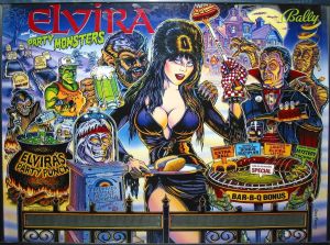 Elvira and the Party Monsters was released in 1989. It was one of the first pinball machines to require 2 quarters instead of one. The flyers for the machine announced this by saying that “Elvira is no cheap date”. Scared Stiff was released in 1996 and since pinball wasn’t as popular then as it was in 1989, that table is a bit harder to find. Both Midway machines offered vendors a special “modesty decal” that they could optionally attach to the backglass to cover up Elvira’s famous cleavage.
